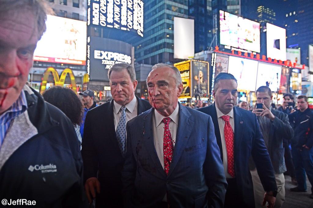 As he worked his way through the crowd, an unidentified protester tossed fake blood on him and officers standing nearby. Activist Jeff Rae and photographer-activist Jenna Pope, who were among the crowd, managed to capture the scene only seconds after it happened.