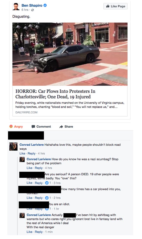 Lariviere also questioned whether the driver of the car that struck the crowd was a "nazi scumbag."